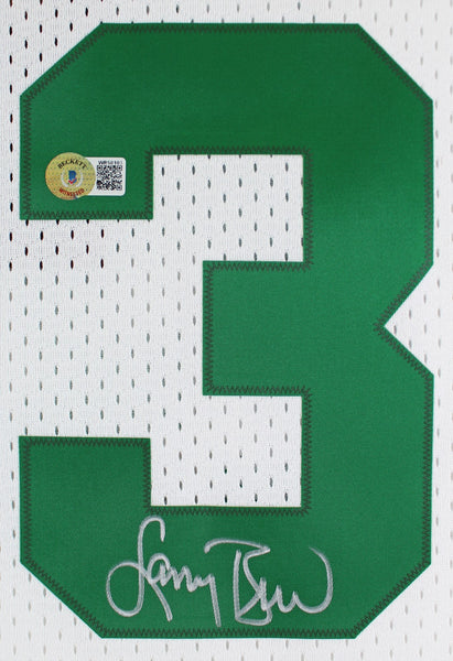 This Autographed 1985 White Mitchell & Ness Hardwood Classics Swingman Jersey has been Personally Signed by Larry Bird. This item is 100% Authentic to include a hologram by Beckett Authentication Services. This item will come with an affixed Beckett Authentication Services (BAS) authentication sticker, which includes a scannable QR code to verify authenticity. Please note that Beckett no longer provides serial-numbered COA cards, and the attached BAS sticker will serve as the complete authentication for this item. This is a BAS Witnessed Protection Program item which means a Beckett Authentication Service representative was present when this item was being signed. We conducted an autograph signing with Larry Bird where multiples of the same item were signed. While the photographs are representative of this item, the size, placement and strength of the signature may vary. Each item is hand signed, therefore, each autograph is unique. This item can be verified through BAS Witnessed. This is a X-Large sized Jersey. This jersey will be framed to order, it will take approximately 3-4 business days from purchase date for it to ship.