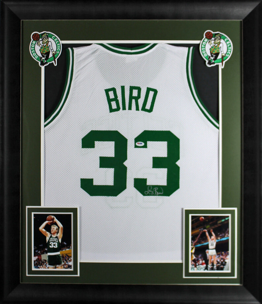 This Autographed White Pro Style Framed Jersey has been Personally Signed by Larry Bird of the Boston Celtics. This item is 100% Authentic to include a hologram by Beckett Authentication Services. This item may come with the new Beckett Authentication hologram that has a scannable QR code rather than the traditional COA. If you would like to have a COA, you are welcome to reach out to Beckett for a printed certification once you receive your item. This is a BAS Witnessed Protection Program item which means a Beckett Authentication Service representative was present when this item was being signed. We conducted an autograph signing with Larry Bird where multiples of the same item were signed. While the photographs are representative of this item, the size, placement and strength of the signature may vary. Each item is hand signed, therefore, each autograph is unique. This item can be verified through BAS Witnessed. This item can be verified through BAS. This item has been professionally framed to overall dimensions of approximately 32 x 37 inches. This is a X-Large sized, non-branded, custom-stitched Framed Jersey. This jersey will be framed to order, it will take 3-4 days from purchase date for it to ship.