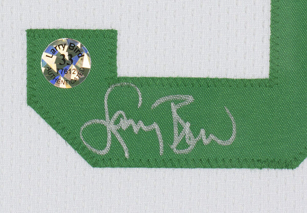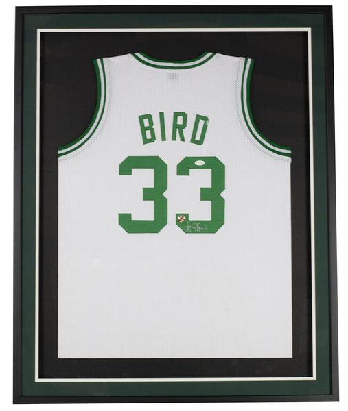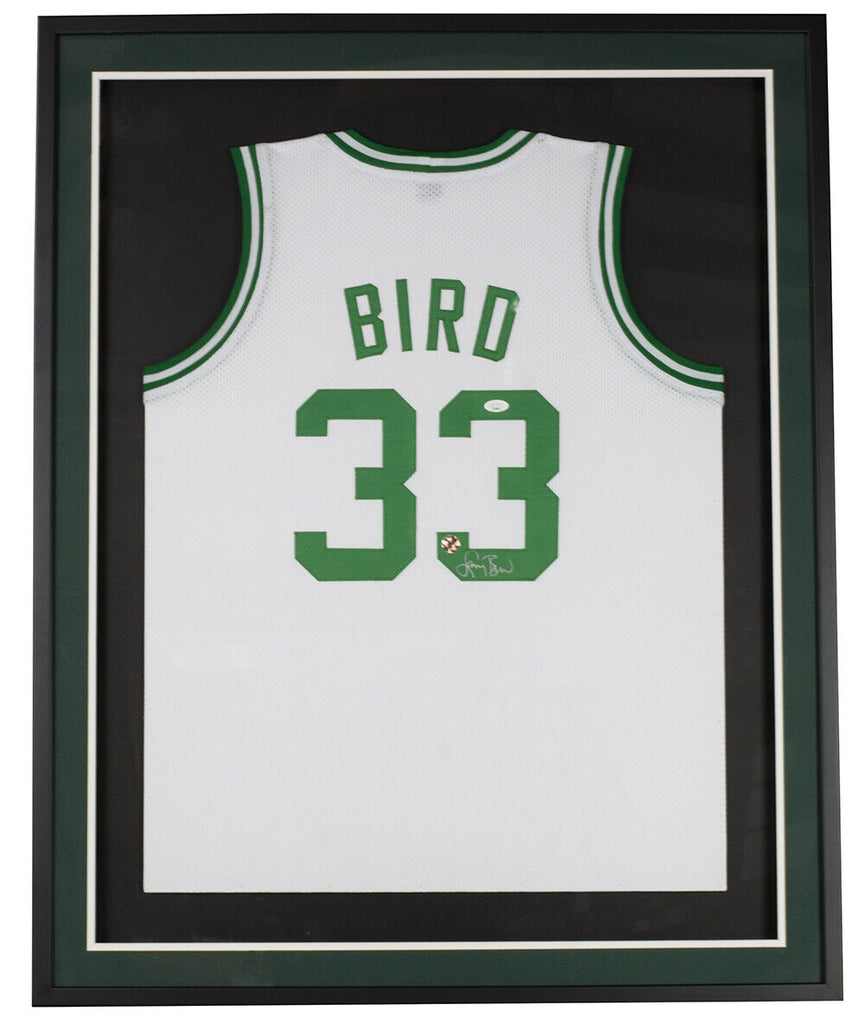 Featured is a Larry Bird signed framed custom white basketball jersey. This jersey was hand signed by Larry Bird and has been authenticated by JSA authentication services. Included with the jersey is a JSA hologram and certificate of authentication. The jersey is professionally framed and matted, measures approximately 32x36. Brand new professional framing and ready to display! This item would make a great addition to any sports memorabilia collection!. SPECIFICATIONS Autographed By: Larry Bird Team: Boston Celtics Sport: Basketball Authentication: James Spence Authentication (JSA)