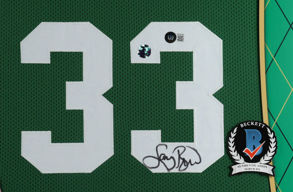 Custom frame measures 35.5" x 43.5" in size and features a jersey hand-signed by Larry Bird (HOF). Please note, there are a few bubbles in the italic (See Photo).The lot / autograph(s) includes an official Beckett Authentication Services serially-numbered hologram and matching COA as well as an official Larry Bird player hologram for authenticity purposes. The signing of this item was witnessed by Beckett.Authentication: Beckett COA & Bird Hologram