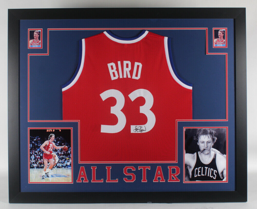Custom framed display measures approximately 35.5" x 43.5" in size and features an All-Star Game jersey that has been hand-signed by Larry Bird (Boston Celtics, HOF). The lot / autograph(s) includes an official Beckett Authentication Services hologram and matching LOA for authenticity purposes. Authentication: Beckett LOA