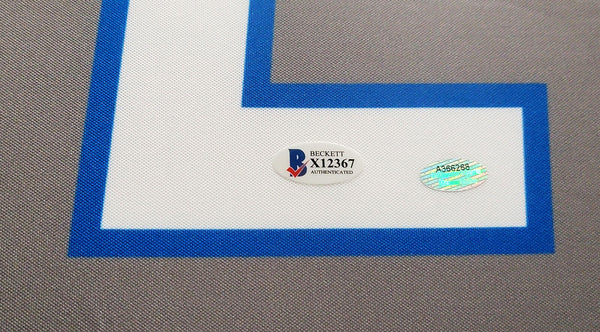 This is a framed Gray Nike Detroit Lions Jersey, approximately 31x36 with the frame, that has been hand signed by Barry Sanders. Please note, this jersey is attached to the framed item through small plastic ties as shown in the photo. This item has been witnessed and certified authentic by Beckett Authentication (BAS) and comes with their tamper-proof witness sticker. Beckett Authentication has recently changed their physical certificate card policy where they no longer match their tamper-proof sticker with a physical certificate. A certificate can be printed on Beckett's website for the matching authentication number. This hologram is placed on the front side of the jersey.