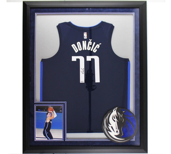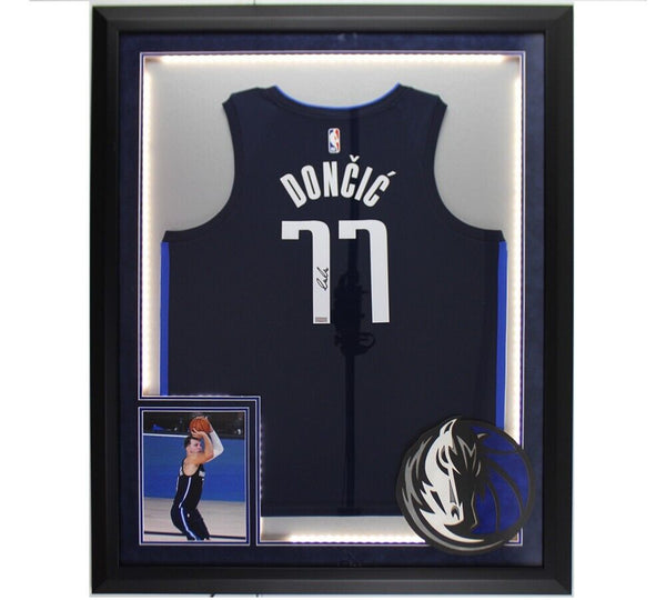 A Dallas Mavericks LED Framed Nike Swingman Navy Blue NBA Jersey hand signed by Luka Doncic. The item and signature are in excellent condition. The frame measures approximately 36"x44" and features an 8x10 of Luka. Luka is a NBA guard for the Dallas Mavericks. He is a 2020 NBA All-Star, 2019 NBA Rookie of the Year and 2019 NBA All-Rookie First Team. AUTHENTICATION: The item is accompanied by a Panini Authentic Certificate of Authenticity - Panini Authentic Serial Numbered and Databased Hologram