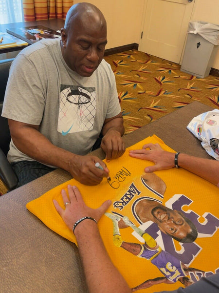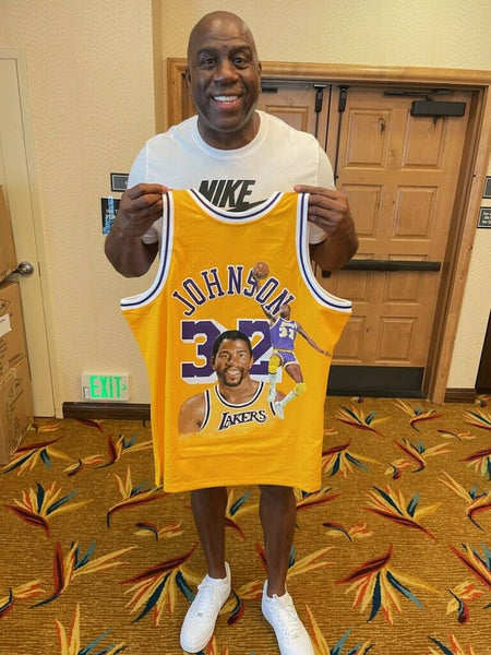 This Autographed Hand Painted Yellow Mitchell & Ness 1984*85 Throwback Hardwood Classics Swingman Framed Jersey with the inscription of "#32, HOF 02" has been Personally Signed by Magic Johnson of the Los Angeles Lakers. This item is 100% Authentic to include a hologram by Beckett Authentication Services. This item will come with the new Beckett Authentication hologram that has a scannable QR code rather than the traditional COA. If you would like to have a COA, you are welcome to reach out to Beckett for a printed certification once you receive your item. This is a BAS Witnessed Protection Program item which means a Beckett Authentication Service representative was present when this item was being signed. The authenticity can be verified on Beckett Authentication Services website. This item has been professionally framed to overall dimensions of approximately 36.5 x 45 inches. This is a X-Large sized Framed Jersey. A printed 5x7 proof photo will be provided with this item. The jersey has been certed on the front, and unfortunately we do not have the cert number from Beckett.