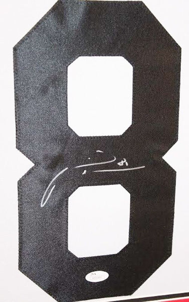 Custom framed display measures 35" x 43" in size. Features a jersey which has been hand-signed in silver paint pen by Marian Hossa. The autograph includes an official James Spence Authentication (JSA) hologram and matching COA for authenticity purposes.Authentication: JSA COA