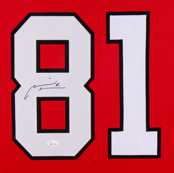 Custom frame measures approximately 35" x 43" in size and features a jersey which has been hand-signed in black felt-tip pen by Marian Hossa. The autograph includes an official James Spence Authentication (JSA) hologram and matching COA for authenticity purposes. The signing of this item was witnessed by JSA.Authentication: JSA COA