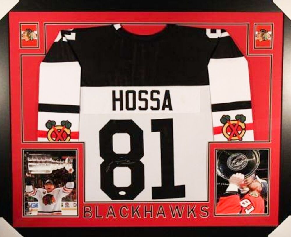 Custom framed display measures 35" x 43" in size. Features a jersey which has been hand-signed in silver paint pen by Marian Hossa. The autograph includes an official James Spence Authentication (JSA) hologram and matching COA for authenticity purposes.Authentication: JSA COA