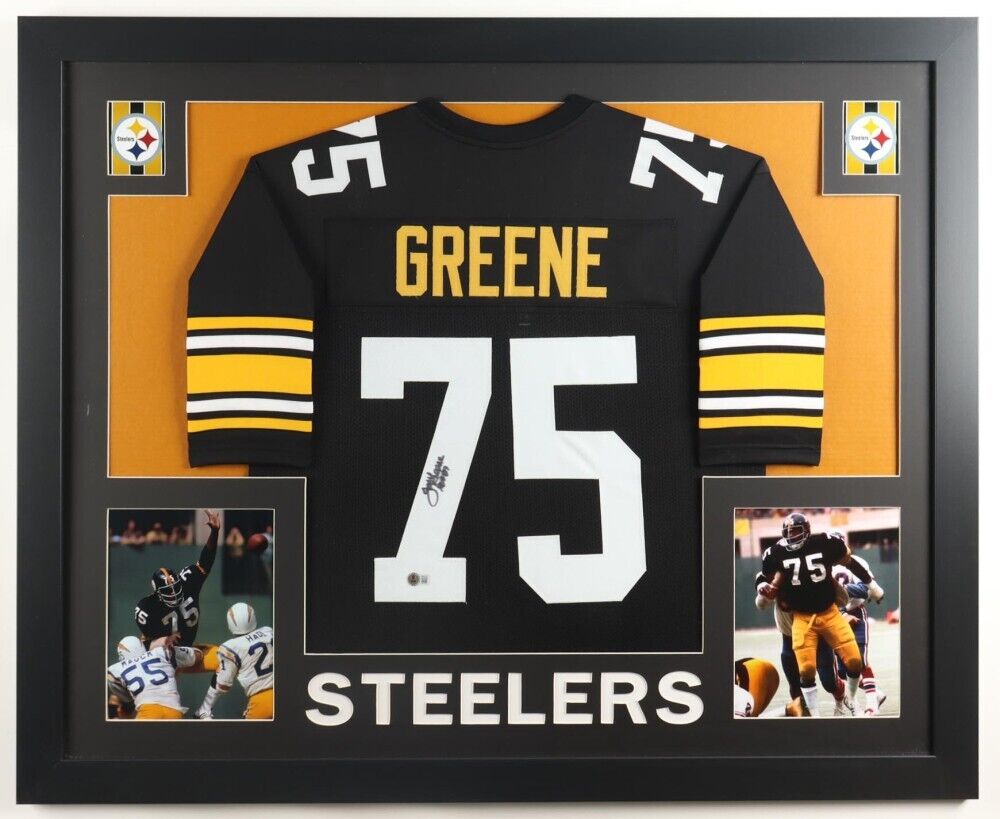 Custom frame measures approximately 35" x 44" in size. Features a jersey that has been hand-signed and inscribed by Joe Greene (Pittsburgh Steelers, HOF).The autograph includes an official Beckett Authentication Services serially numbered hologram and QR Code card for authenticity purposes. The signing of this item was witnessed by Beckett.Authentication: Beckett QR Code card