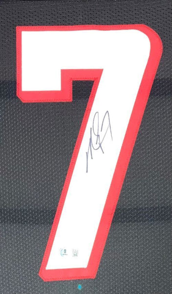 Featured is a Michael Vick signed custom football jersey. This jersey has been hand signed by Vick and comes with the Beckett hologram and certificate of authenticity. This jersey features professionally sewn letters and numbers and is size XL. This jersey has no team tags or emblems and is intended as a sports collectible. This jersey has been professionally framed and matted and is approximately 32x42. This jersey would make a great addition to any sports memorabilia collection!. SPECIFICATIONS Autographed By: Michael Vick Team: Atlanta Falcons Sport: Football Authentication: Beckett Grading Services