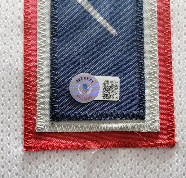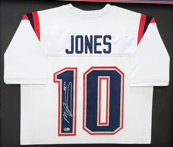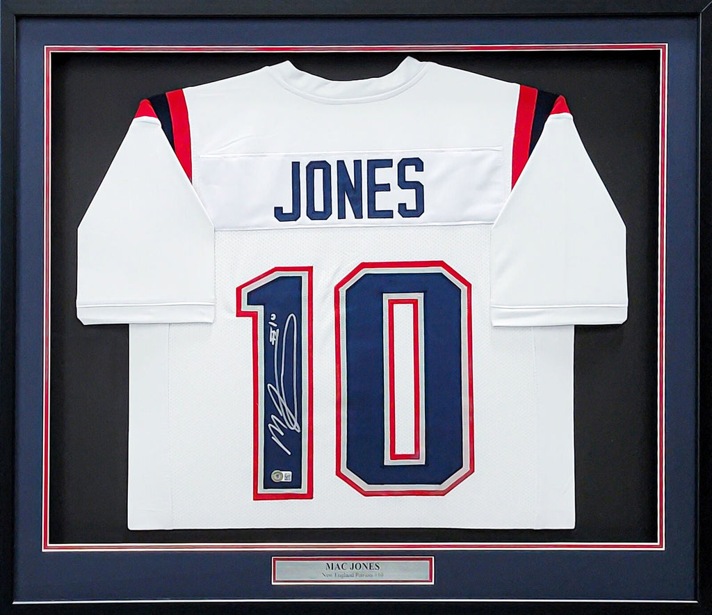 This is a framed White Jersey, approximately 31x36 with the frame, that has been hand signed by Mac Jones. This is a custom jersey with no name brand. The approximate size is XL. It has nice sewn in name and numbers. This item has been certified authentic by Beckett Authentication (BAS) and comes with their tamper-proof QR Code sticker that can be verified on the Beckett-authentication.com.