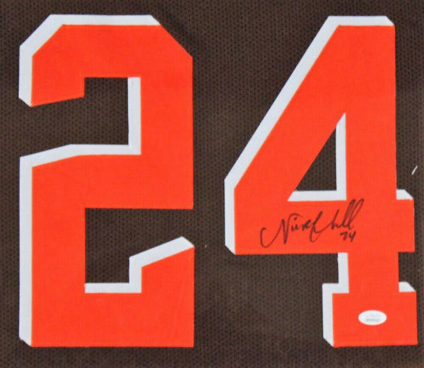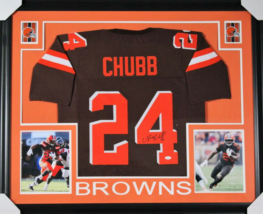 Custom frame measures approximately 35" x 43" in size and features a jersey which has been hand-signed in black felt-tip pen by Nick Chubb. The lot / autograph(s) includes an official James Spence Authentication (JSA) hologram and matching COA for authenticity purposes. The signing of this item was witnessed by JSA.Authentication: JSA COA