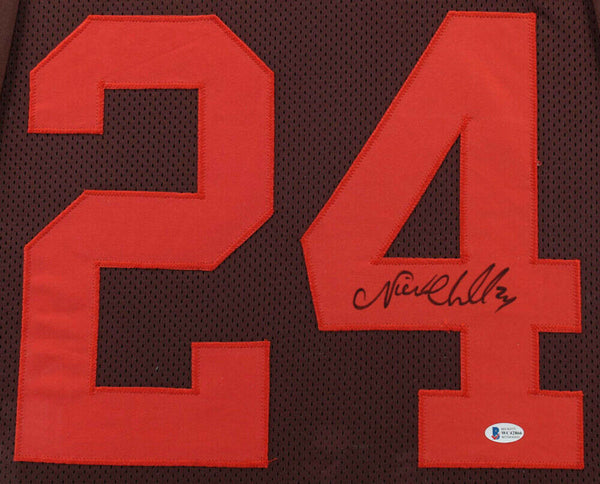 Custom frame measures approximately 35" x 43" in size and features a jersey which has been hand-signed by Nick Chubb. The lot / autograph(s) includes an official Beckett Authentication Services serially numbered hologram and matching COA for authenticity purposes. The signing of this jersey was witnessed by Beckett. Authentication: Beckett COA