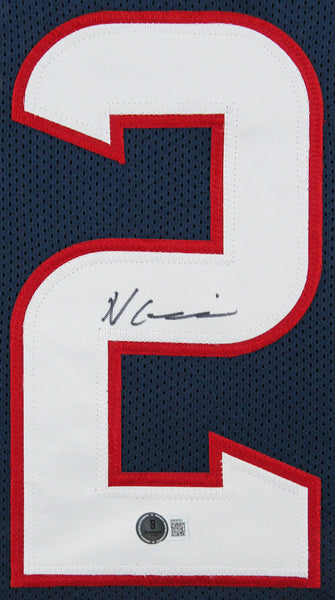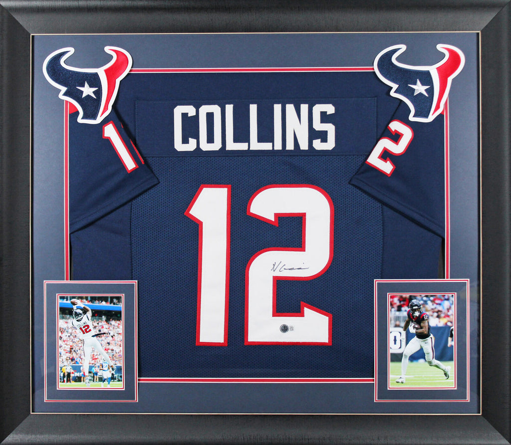 This Autographed Navy Blue Pro Style Framed Jersey has been Personally Signed by Nico Collins of the Houston Texans. This item is 100% Authentic to include a hologram by Beckett Authentication Services. This item will come with an affixed Beckett Authentication Services (BAS) authentication sticker, which includes a scannable QR code to verify authenticity. Please note that Beckett no longer provides serial-numbered COA cards, and the attached BAS sticker will serve as the complete authentication for this item. This is a BAS Witnessed Protection Program item which means a Beckett Authentication Service representative was present when this item was being signed. We conducted an autograph signing with Nico Collins where multiples of the same item were signed. While the photographs are representative of this item, the size, placement and strength of the signature may vary. Each item is hand signed, therefore, each autograph is unique. This item can be verified through BAS Witnessed. This item has been professionally framed to overall dimensions of approximately 32 x 37 inches. This is a X-Large sized, non-branded, custom-stitched Framed Jersey. This jersey will be framed to order, it will take 3-4 days from purchase date for it to ship.
