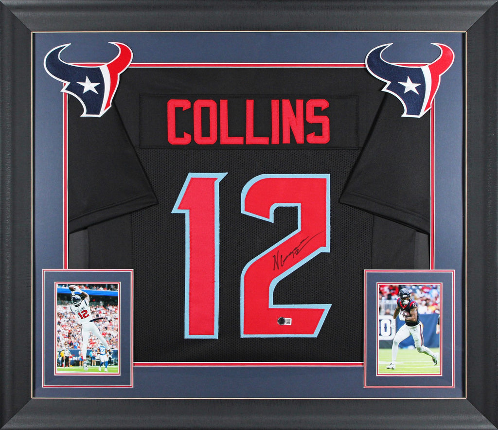 This Autographed Alternate Navy Blue Pro Style Framed Jersey has been Personally Signed by Nico Collins of the Houston Texans. This item is 100% Authentic to include a hologram by Beckett Authentication Services. This item will come with an affixed Beckett Authentication Services (BAS) authentication sticker, which includes a scannable QR code to verify authenticity. Please note that Beckett no longer provides serial-numbered COA cards, and the attached BAS sticker will serve as the complete authentication for this item. This is a BAS Witnessed Protection Program item which means a Beckett Authentication Service representative was present when this item was being signed. We conducted an autograph signing with Nico Collins where multiples of the same item were signed. While the photographs are representative of this item, the size, placement and strength of the signature may vary. Each item is hand signed, therefore, each autograph is unique. This item can be verified through BAS Witnessed. This item has been professionally framed to overall dimensions of approximately 32 x 37 inches. This is a X-Large sized, non-branded, custom-stitched Framed Jersey. This jersey will be framed to order, it will take approximately 3-4 business days from purchase date for it to ship.