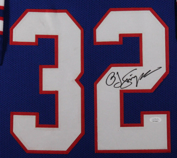 O.J. Simpson Autographed/Signed Buffalo Framed Blue XL Stat Jersey JSA 32971 The number in the listing title is just an inventory sku for our records and is not the authentication number. This is a professionally framed custom pro style blue XL jersey with sewn on name and numbers that was personally autographed by OJ Simpson. Includes a certificate of authenticity from James Spence Authentication (JSA) and Denver Autographs.