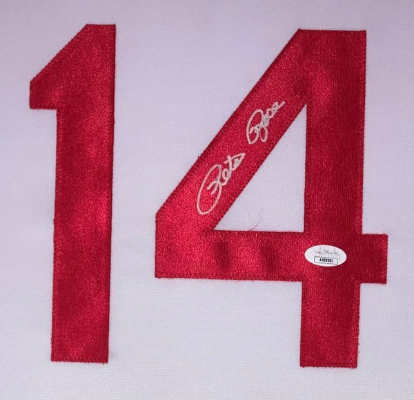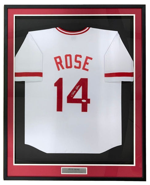 Featured is a Pete Rose signed custom baseball jersey. This jersey has been hand signed by Rose and comes with the JSA hologram. This jersey features professionally sewn letters and numbers and is size XL. This jersey has no team tags or emblems and is intended as a sports collectible. This jersey has been professionally framed and matted and is approximately 32x42. This jersey would make a great addition to any sports memorabilia collection!. SPECIFICATIONS Autographed By: Pete Rose Team: Cincinnati Reds Sport: Baseball Authentication: James Spence Authentication (JSA)