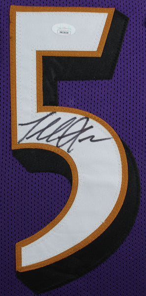 This Autographed Purple Pro Style Framed Jersey has been Personally Signed by Terrell Suggs of the Baltimore Ravens. This item is 100% Authentic to include a Certificate of Authenticity (COA) / hologram by JSA Witness. This is a JSA Witnessed Protection Program item which means a JSA representative was present when this item was being signed. We conducted an autograph signing with Terrell Suggs where multiples of the same item were signed. While the photographs are representative of this item, the size, placement and strength of the signature may vary. Each item is hand signed, therefore, each autograph is unique. This item can be verified through JSA Witness. This item has been professionally framed to overall dimensions of approximately 32 x 37 inches. This is a X-Large sized, non-branded, custom-stitched Framed Jersey. This jersey will be framed to order, it will take 3-4 days from purchase date for it to ship.