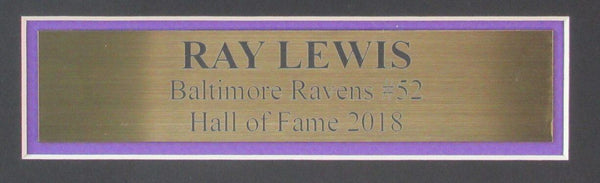Ray Lewis Autographed Framed Purple Baltimore Ravens Jersey. The outer frame size is 41 inches x 33 inches x 2 inches. This jersey is authenticated by Beckett and includes their Tamper-proof Sticker.