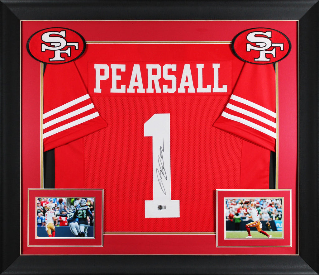 This Autographed Red Pro Style Framed Jersey has been Personally Signed by Ricky Pearsall of the San Francisco 49ers. This item is 100% Authentic to include a hologram by Beckett Authentication Services. This item will come with an affixed Beckett Authentication Services (BAS) authentication sticker, which includes a scannable QR code to verify authenticity. Please note that Beckett no longer provides serial-numbered COA cards, and the attached BAS sticker will serve as the complete authentication for this item. This is a BAS Witnessed Protection Program item which means a Beckett Authentication Service representative was present when this item was being signed. We conducted an autograph signing with Ricky Pearsall where multiples of the same item were signed. While the photographs are representative of this item, the size, placement and strength of the signature may vary. Each item is hand signed, therefore, each autograph is unique. This item can be verified through BAS Witnessed. This item has been professionally framed to overall dimensions of approximately 32 x 37 inches. This is a X-Large sized, non-branded, custom-stitched Framed Jersey. This jersey will be framed to order, it will take approximately 3-4 days from purchase date for it to ship.
