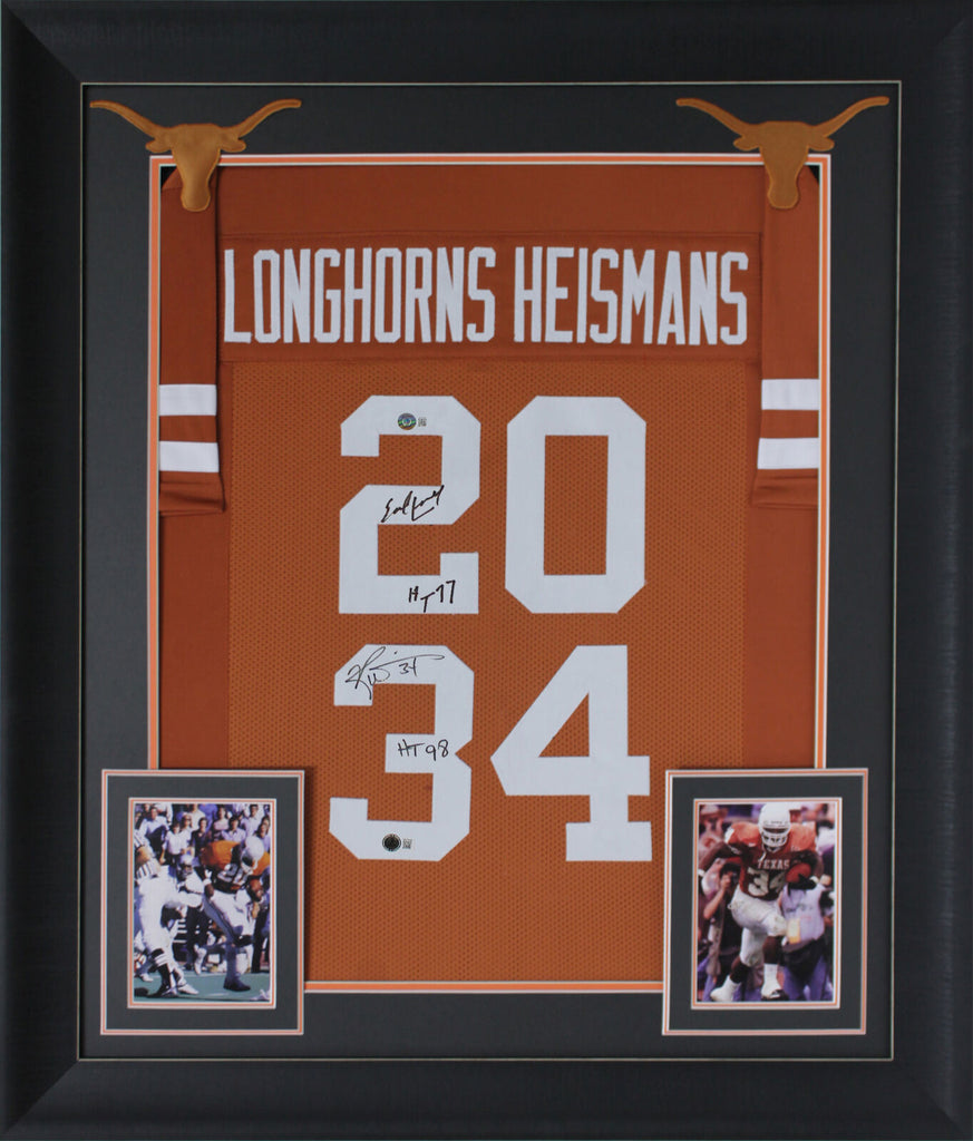 This Autographed Burnt Orange Pro Style Framed Jersey with the inscription of "HT 98 (Williams), HT 77 (Campbell)" has been Personally Signed by Ricky Williams & Earl Campbell of the Texas Longhorns. This item is 100% Authentic to include a hologram by Beckett Authentication Services. This item will come with an affixed Beckett Authentication Services (BAS) authentication sticker, which includes a scannable QR code to verify authenticity. Please note that Beckett no longer provides serial-numbered COA cards, and the attached BAS sticker will serve as the complete authentication for this item. This is a BAS Witnessed Protection Program item which means a Beckett Authentication Service representative was present when this item was being signed. We conducted an autograph signing with Ricky Williams & Earl Campbell where multiples of the same item were signed. While the photographs are representative of this item, the size, placement and strength of the signature may vary. Each item is hand signed, therefore, each autograph is unique. This item can be verified through BAS Witnessed. This item has been professionally framed to overall dimensions of approximately 32 x 37 inches. This is a X-Large sized, non-branded, custom-stitched Framed Jersey. This jersey will be framed to order, it will take 3-4 days from purchase date for it to ship.
