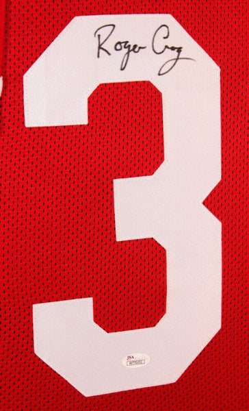 Custom frame measures approximately 35" x 43" in size and features a jersey which has been hand-signed in black felt tip pen by Roger Craig. The autograph includes an official James Spence Authentication (JSA) hologram and matching COA for authenticity purposes.Authentication: JSA COA