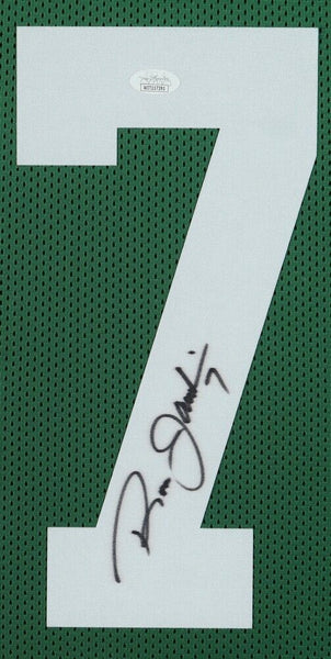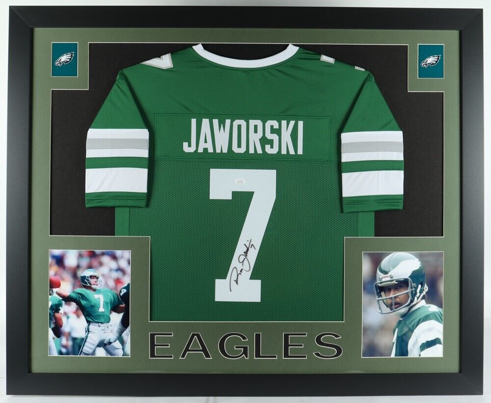 Custom frame measures approximately 35" x 43" in size and features a jersey that has been hand-signed by Ron Jaworski.The lot / autograph(s) includes an official James Spence Authentication (JSA) hologram and QR Code card for authenticity purposes. The signing of this item was witnessed by JSA.Authentication: JSA Hologram & QR Code Card
