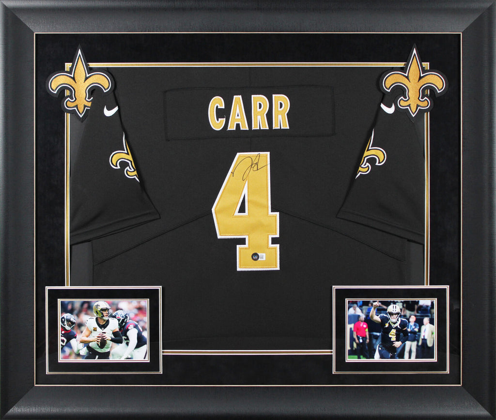 This Autographed Black Nike Framed Jersey has been Personally Signed by Derek Carr of the New Orleans Saints. This item is 100% Authentic to include a hologram by Beckett Authentication Services. This item will come with an affixed Beckett Authentication Services (BAS) authentication sticker, which includes a scannable QR code to verify authenticity. Please note that Beckett no longer provides serial-numbered COA cards, and the attached BAS sticker will serve as the complete authentication for this item. The authenticity can be verified on Beckett Authentication Services website. This item has been professionally framed to overall dimensions of approximately 32 x 37 inches. This is a X-Large sized Framed Jersey.