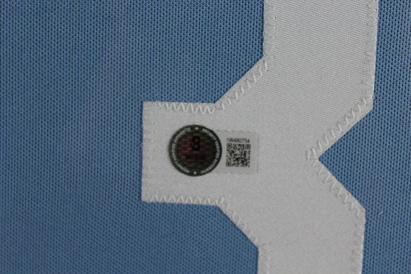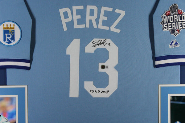Salvador Perez has autographed this official Kansas City jersey and written 15 WS MVP for being the 2015 World Series MVP. Jersey is a size XL name and numbers sewn on. Autograph was witnessed and authenticated by Beckett Authentication Services (BAS). Simply scan the QR code hologram on your item to verify authenticity on their site. 100% authentic. Frame measures 35x43 and comes with UV plexi glass to protect your item. Any glare in the image is just from the image being taken.