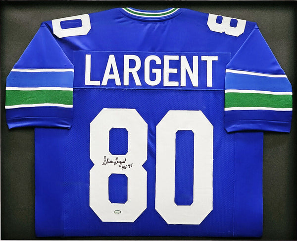 This is a framed Blue Jersey, approximately 31x36 with the frame, that has been hand signed by Steve Largent. This item was inscribed "HOF 95." This item was signed in the presence of a Mill Creek Sports representative and comes with their serial numbered hologram and matching certificate of authenticity.