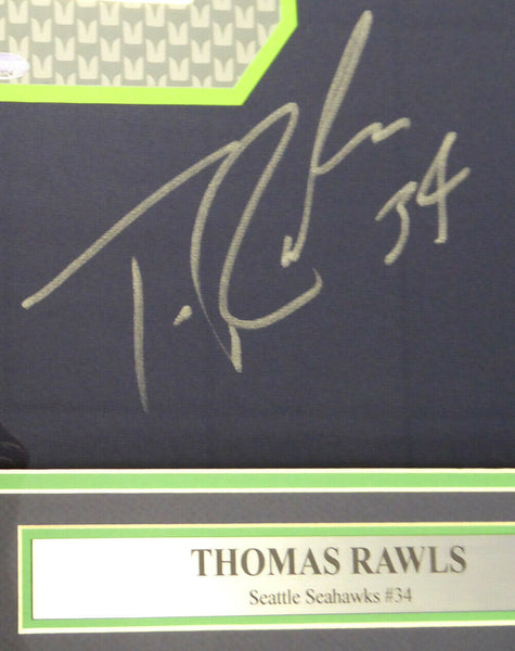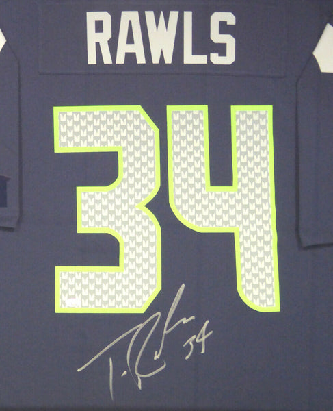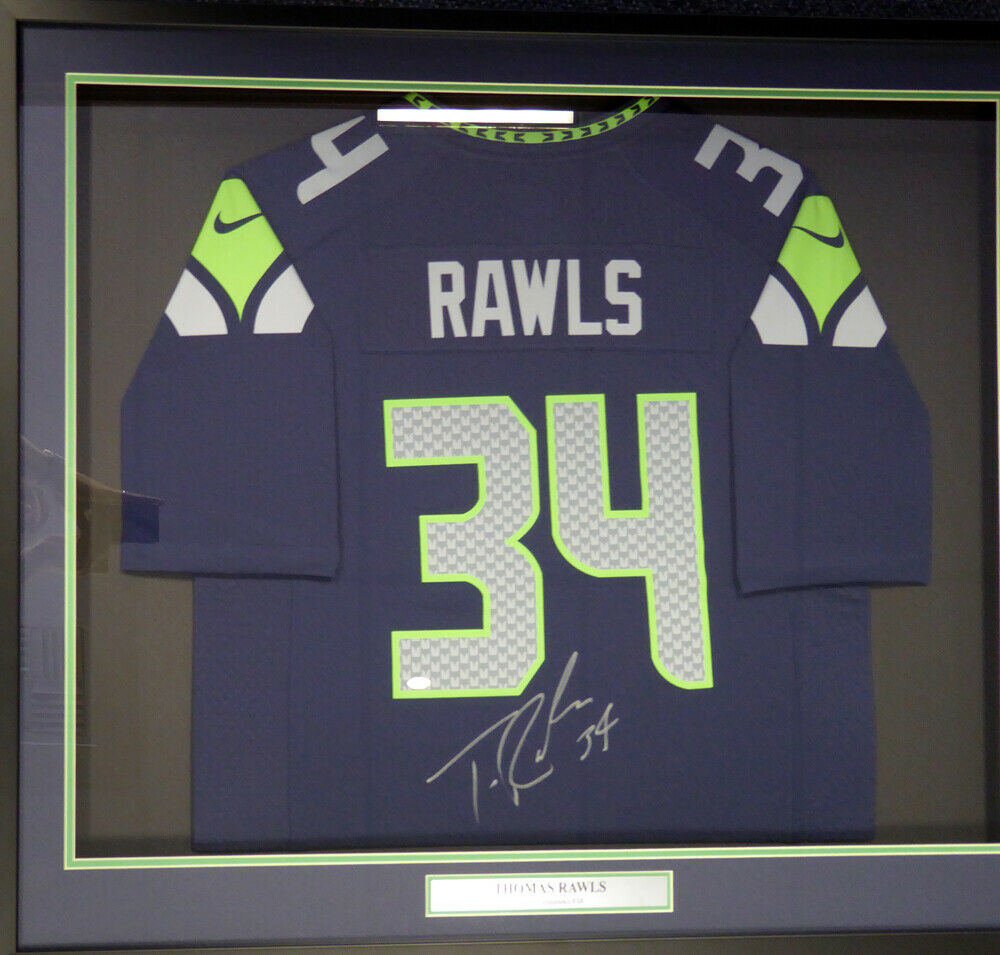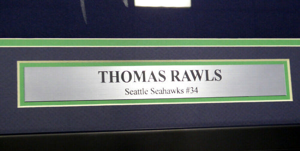 This is a Framed blue Seattle Seahawks Nike jersey, approximately 31x36 with the frame, that has been hand signed by Thomas Rawls. The jersey is Size XL. This jersey comes with the official Mill Creek Sports tamper-proof hologram and matching certificate for authenticity. This hologram only gets applied to items in which Mill Creek Sports witnesses the signature.