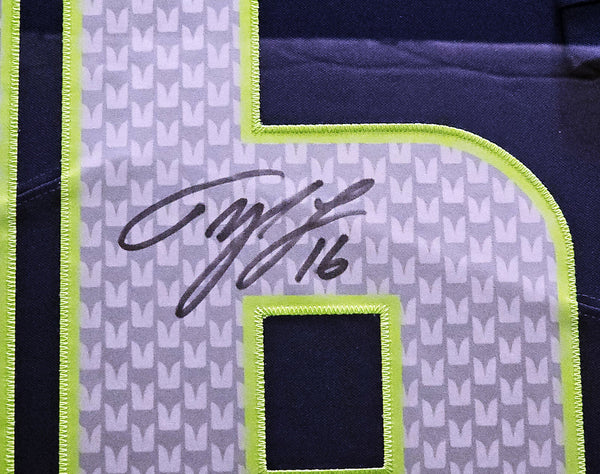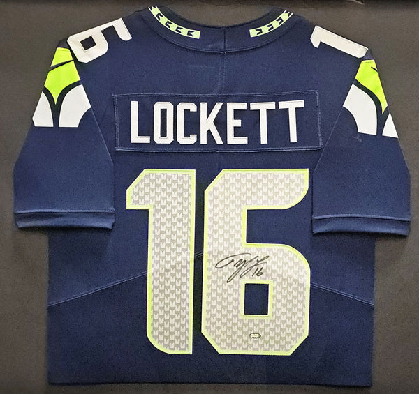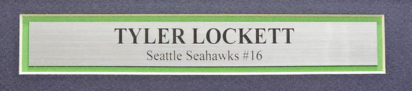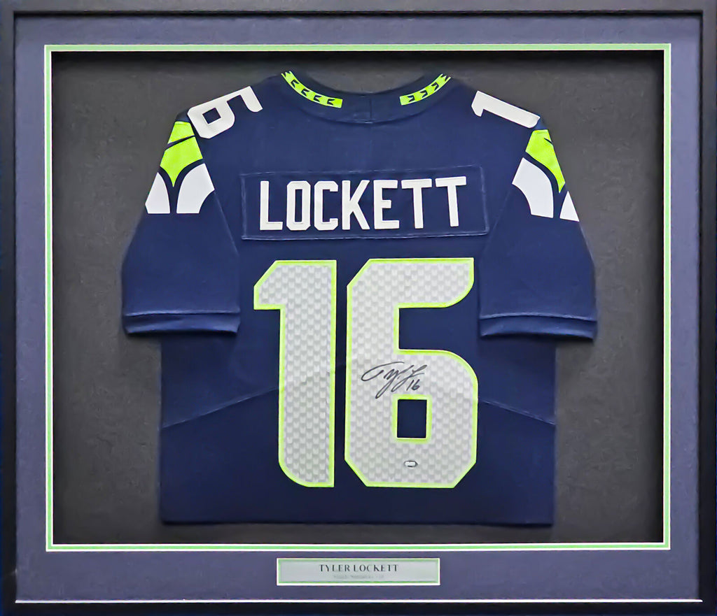 This is a framed Blue Nike Seattle Seahawks Twill Jersey, approximately 31x36 with the frame, that has been hand signed by Tyler Lockett. This item was signed in the presence of a Mill Creek Sports representative and comes with their serial numbered hologram and matching certificate of authenticity.