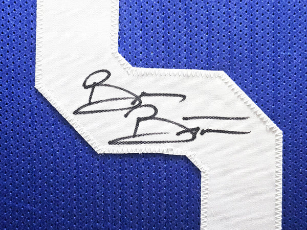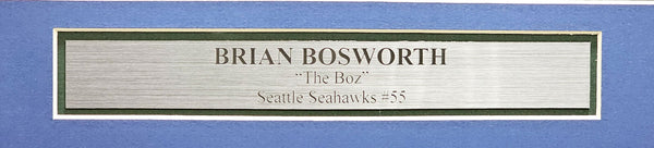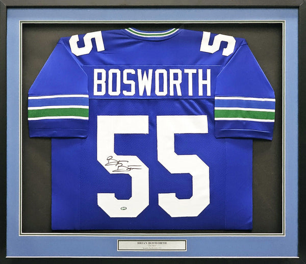 This is a framed Blue Jersey, approximately 31x36 with the frame, that has been hand signed by Brian Bosworth. This item was signed in the presence of a Mill Creek Sports representative and comes with their serial numbered hologram and matching certificate of authenticity.
