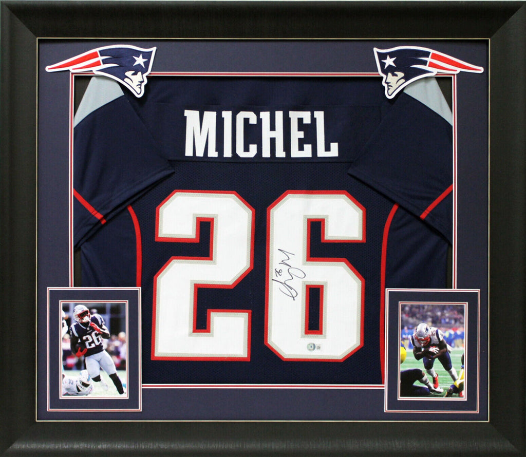 This Autographed Navy Blue Pro Style Framed Jersey has been Personally Signed by Sony Michel of the New England Patriots. This item is 100% Authentic to include a Certificate of Authenticity (COA) / hologram by Beckett Authentication Services. This is a BAS Witnessed Protection Program item which means a Beckett Authentication Service representative was present when this item was being signed. We conducted an autograph signing with Sony Michel where multiples of the same item were signed. While the photographs are representative of this item, the size, placement and strength of the signature may vary. Each item is hand signed, therefore, each autograph is unique. This item can be verified through BAS Witnessed. This item has been professionally framed to overall dimensions of approximately 32 x 37 inches. This is a X-Large sized, non-branded, custom-stitched Framed Jersey.