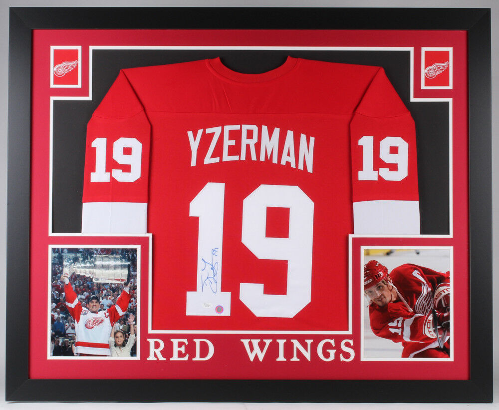 Custom frame measures approximately 35" x 43" in size and features a jersey which has been hand-signed in blue felt-tip pen by Steve Yzerman (Red Wings, HOF). Includes an official James Spence Authentication (JSA) hologram and matching COA as well as an official Steve Yzerman hologram for authenticity purposes.Authentication: JSA COA & Yzerman Hologram