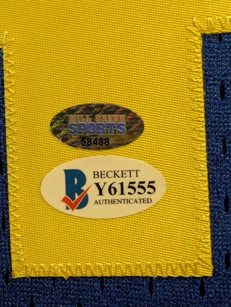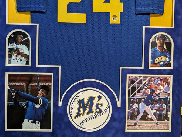 Custom Framed in SUEDE Ken Griffey Jr hand signed Seattle Mariners style custom throwback jersey.Beckett/Mill Creek Sports Stickers only, no cert card includedThe authentication is from Beckett/Mill Creek Sports. This signature is WITNESSED by a representative of Beckett/Mill Creek Sports! 100% AUTHENTIC!!! The jersey has fully stitched numbers on the front and back. It is a great item and a must for all great sports fans!This item is professionally framed, it measures 32"x40" inside , 42"x34" outside , using UV protective Acrylic glass for safe keeping and safe transport, SUEDE team color matting, black moulding and hanging hooks on the back. All additional items in frame seen in pictures included. 100% ready to hang in your fan cave.