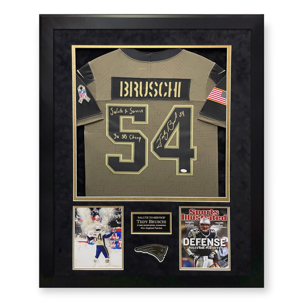This Salute To Service jersey custom framed to 32x40 has been personally hand signed by Tedy Bruschi of the New England PatriotsSalute to Service & 3x SB Champ Inscriptions100% AuthenticCertificate of authenticity by JSAExact location of signature may varyasgmemorabilia.com