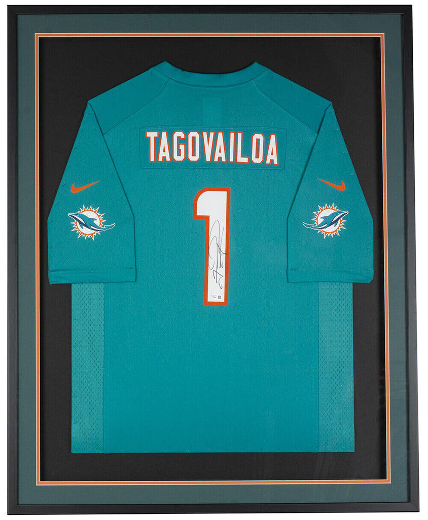 Featured is a Tua Tagovailoa signed framed teal Nike Miami Dolphins football jersey. This jersey was hand signed by Tua Tagovailoa and has been authenticated by Fanatics authentication services. Included with the jersey is a Fanatics hologram and certificate of authentication. This jersey would make a great addition to any sports memorabilia collection. This jersey has hand sewn numbers and letter and has NO logos or any affiliation with any manufacturer or team. It is simply intended as an autographed collectible. SPECIFICATIONS Autographed By: Tua Tagovailoa Team: Miami Dolphins Sport: Football Authentication: Fanatics Authentic