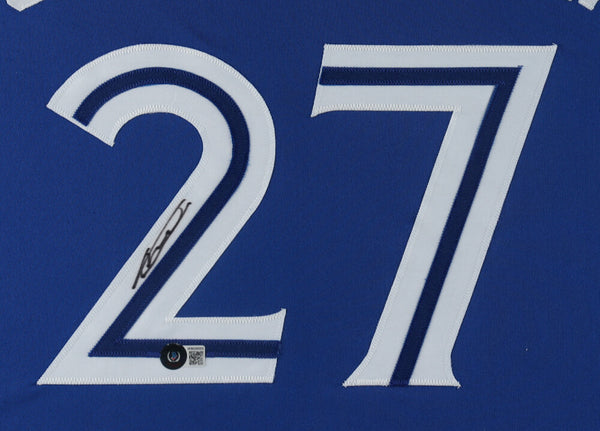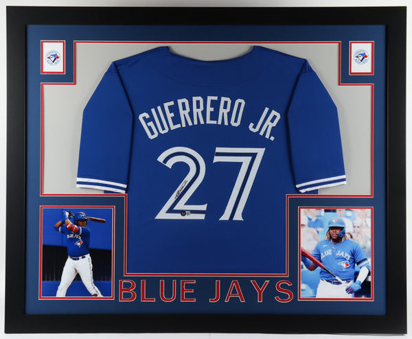 Custom frame measures 35.5" x 43.5" in size and features a jersey hand-signed by Vladimir Guerrero Jr.The lot / autograph(s) includes an official Beckett Authentication Services serially-numbered hologram and QR Code card for authenticity purposes. The signing of this item was witnessed by Beckett.Authentication: Beckett Hologram with QR Code card