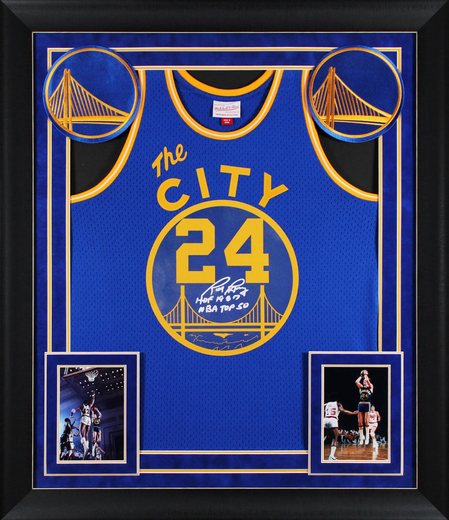This Autographed Blue Mitchell & Ness Throwback Swingman Framed Jersey with the inscription of "HOF 1987, NBA Top 50" has been Personally Signed by Rick Barry of the Golden State Warriors. This item is 100% Authentic to include a hologram by Beckett Authentication Services. This item will come with an affixed Beckett Authentication Services (BAS) authentication sticker, which includes a scannable QR code to verify authenticity. Please note that Beckett no longer provides serial-numbered COA cards, and the attached BAS sticker will serve as the complete authentication for this item. This is a BAS Witnessed Protection Program item which means a Beckett Authentication Service representative was present when this item was being signed. We have multiples of this same item. While the photographs are representative of this item, the size, placement and strength of the signature may vary. Each item is hand signed, therefore, each autograph is unique. This item has been professionally framed to overall dimensions of approximately 32 x 37 inches. This is a X-Large sized Framed Jersey. This jersey will be framed to order, it will take approximately 3-4 business days from purchase date for it to ship.