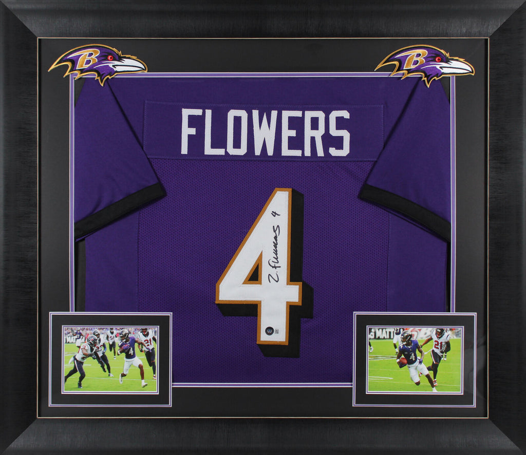 This Autographed Purple Pro Style Framed Jersey has been Personally Signed by Zay Flowers of the Baltimore Ravens. This item is 100% Authentic to include a hologram by Beckett Authentication Services. This item will come with an affixed Beckett Authentication Services (BAS) authentication sticker, which includes a scannable QR code to verify authenticity. Please note that Beckett no longer provides serial-numbered COA cards, and the attached BAS sticker will serve as the complete authentication for this item. This is a BAS Witnessed Protection Program item which means a Beckett Authentication Service representative was present when this item was being signed. We conducted an autograph signing with Zay Flowers where multiples of the same item were signed. While the photographs are representative of this item, the size, placement and strength of the signature may vary. Each item is hand signed, therefore, each autograph is unique. This item can be verified through BAS Witnessed. This item has been professionally framed to overall dimensions of approximately 32 x 37 inches. This is a X-Large sized, non-branded, custom-stitched Framed Jersey. This jersey will be framed to order, it will take 3-4 days from purchase date for it to ship.