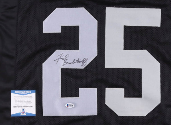 Custom on-field style jersey. Everything sewn on, size XL. Hand-signed by Fred Biletnikoff (Oakland Raiders, HOF).The autograph includes an official Beckett Authentication Services serially-numbered hologram and matching COA for authenticity purposes.Authentication: Beckett COA