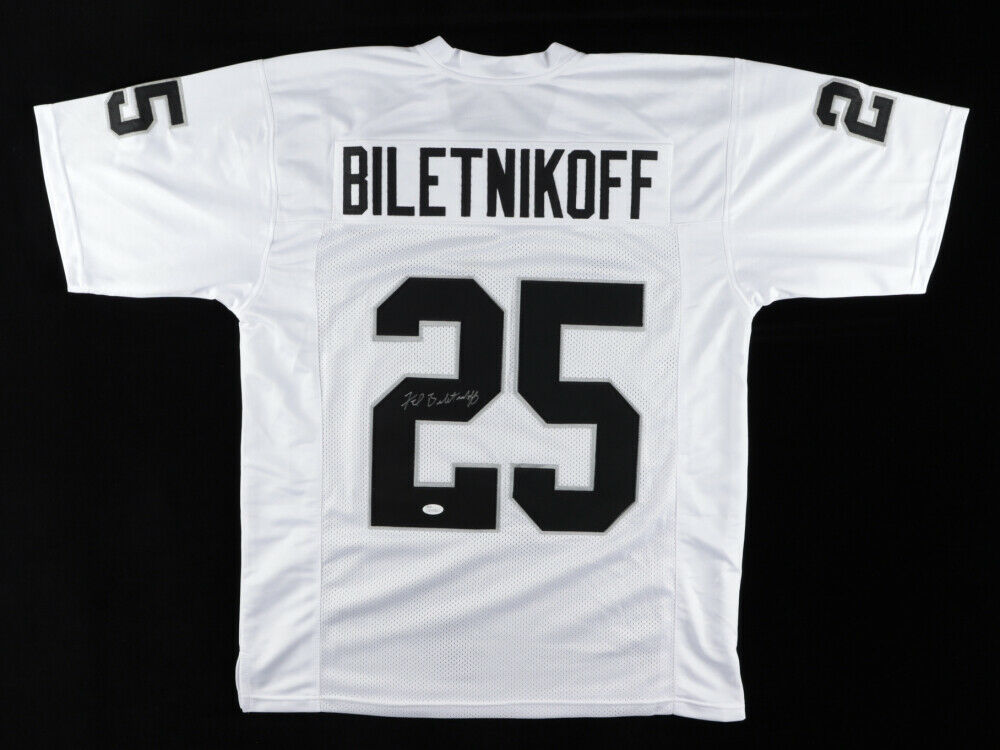Custom on-field style jersey. Everything sewn on, size XL. Has been hand-signed by Fred Biletnikoff (HOF).The lot / autograph(s) includes an official James Spence Authentication (JSA) hologram and matching COA for authenticity purposes. The signing of this item was witnessed by JSA. Authentication: JSA COA