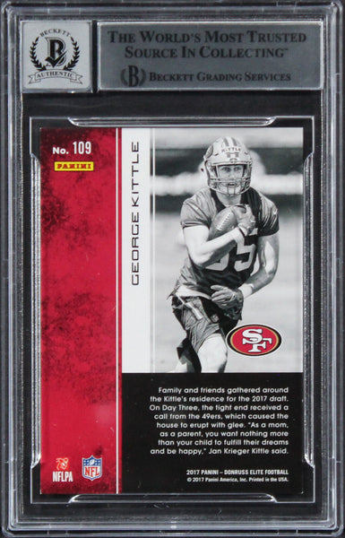 This Autographed Auto Graded Gem Mint 10! 2017 Elite #109 #481/499 Rookie Card has been Personally Signed by George Kittle of the San Francisco 49ers. This item is 100% Authentic, it comes slabbed and authenticated by Beckett Authentication Services. The authenticity can be verified on Beckett Authentication Services website.