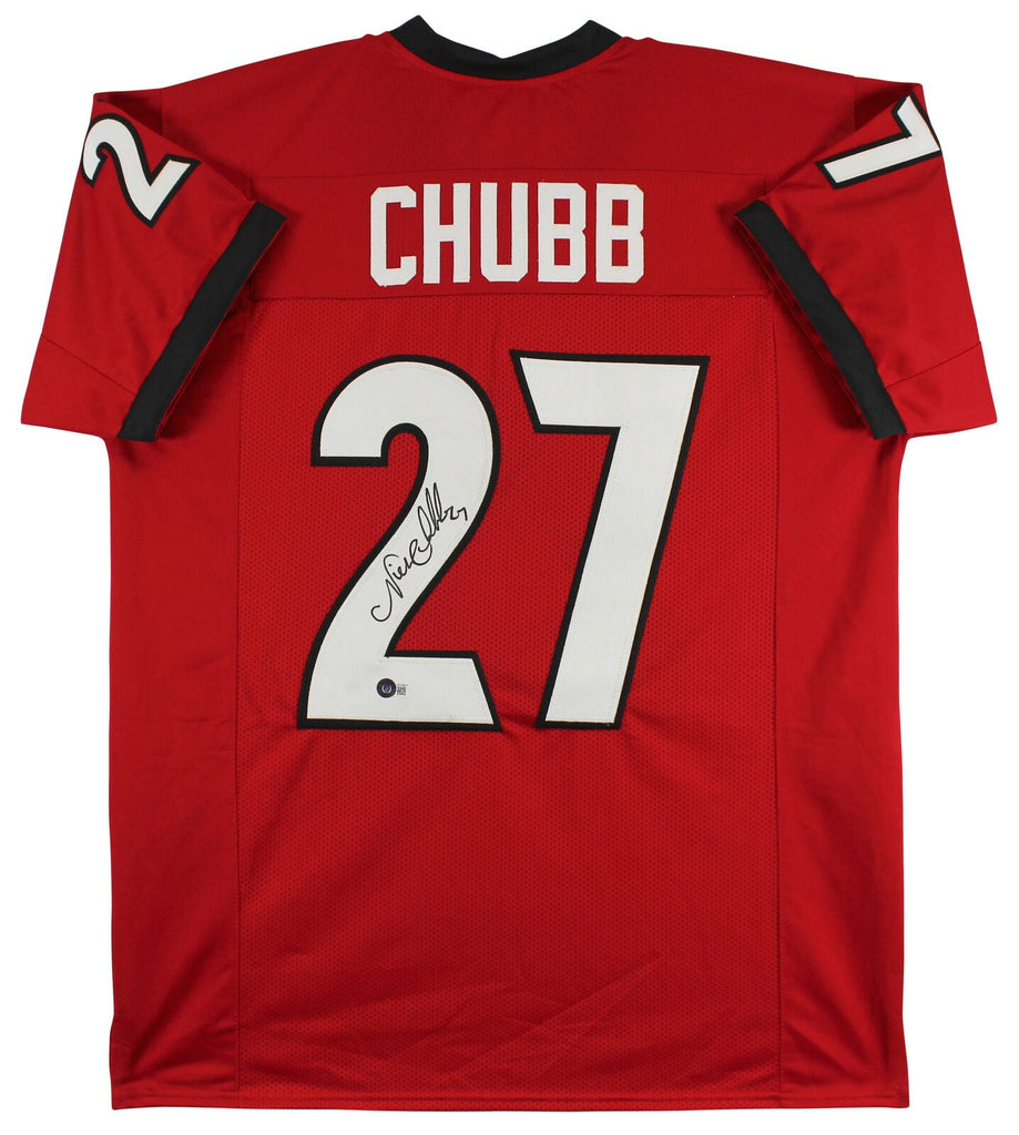This Autographed Red Pro Style Jersey has been Personally Signed by Nick Chubb of the Georgia Bulldogs. This item is 100% Authentic to include a hologram by Beckett Authentication Services. This item will come with the new Beckett Authentication hologram that has a scannable QR code rather than the traditional COA. If you would like to have a COA, you are welcome to reach out to Beckett for a printed certification once you receive your item. This is a BAS Witnessed Protection Program item which means a Beckett Authentication Service representative was present when this item was being signed. This is a stock item. We conducted an autograph signing with Nick Chubb and we have several of these available. The one you will receive will be of equal quality to the one pictured. This item can be verified through BAS Witnessed. This is a X-Large sized, non-branded, custom-stitched Jersey.