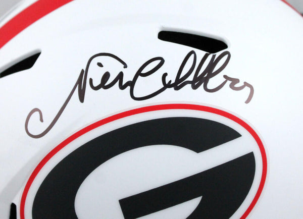 Nick Chubb Autographed Georgia Bulldogs F/S Lunar Speed Helmet-Beckett W Hologram *Black This is a hand autograph of Nick Chubb of the Georgia Bulldogs on a Riddell Football Full Size Lunar Speed Replica Helmet. This item has a Beckett Witnessed Authentication, which comes with a Beckett numbered sticker hologram and a QR code for verification. You can view this item on the Beckett Authentication website, it shows when and where the item was signed. It was signed either at a public autograph appearance or a private signing. This is a stock photo of the item. Although you may not receive this exact item, the item you receive is virtually identical and brand new in great shape.