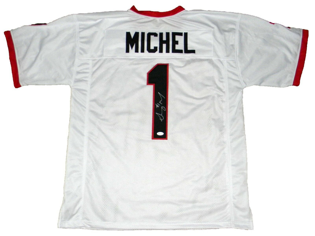 Sony Michel, former star running back for the Georgia Bulldogs, has hand signed this white custom jersey at a private signing. Jersey is size XL and all letters/numbers are sewn-on. This item comes with a certificate of authenticity (COA) from JSA - James Spence Authentication and was signed in the presence of one of their representatives. You will receive a serial-numbered COA along with a matching serial-numbered sticker on the jersey. The authenticity can be verified online by entering the serial number.Item pictured may not be the exact item you will receive. It will be similar quality, and we guarantee your satisfaction.