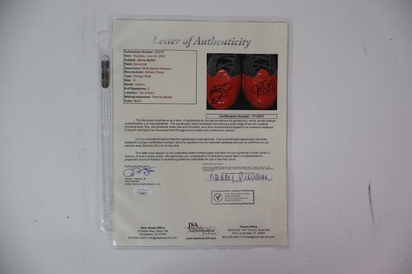 The product is a pair of Jimmy Butler autographed Adidas size 14 shoes, featuring the signature of the basketball player authenticated by James Spence Authentication (JSA). The shoes are original and have been signed by Jimmy Butler, a player who has played for the Golden State Warriors in the NBA. This unique item would be a valuable and collectible piece for fans of both Jimmy Butler and the Golden State Warriors.