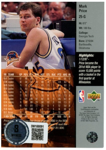 The number in the listing title is just an inventory sku for our records and is not the authentication number. The item pictured is a stock photo unless otherwise noted. This is a Golden State Warriors 1997-1998 Upper Deck #40 Trading Card that was personally autographed by Mark Price. Includes a certificate of authenticity from Beckett Authentication Services (BAS) and Denver Autographs. FREE SHIPPING within the USA on orders over $10!