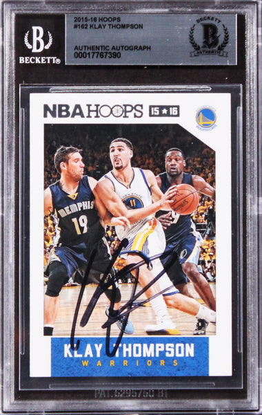 This Autographed 2015 Hoops #162 Card has been Personally Signed by Klay Thompson of the Golden State Warriors. This item is 100% Authentic, it comes slabbed and authenticated by Beckett Authentication Services. The authenticity can be verified on Beckett Authentication Services website.