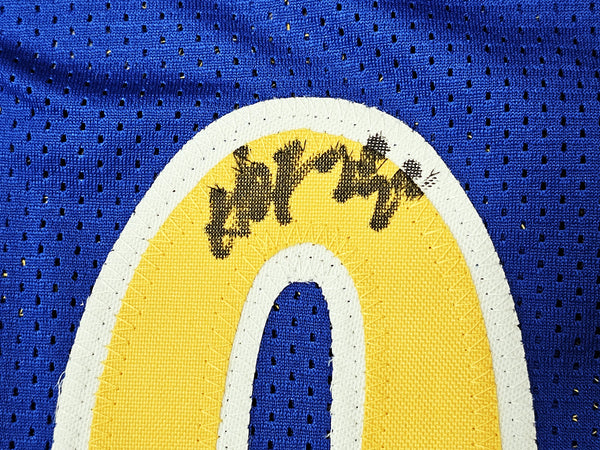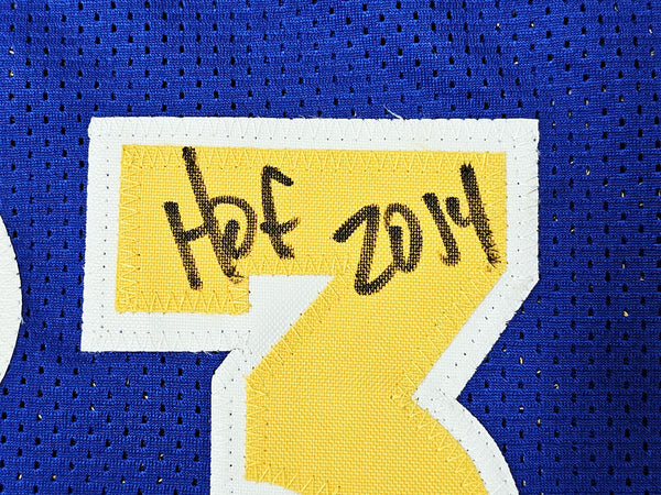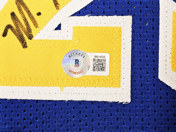 This is a Blue Jersey that has been hand signed by Chris Mullin, Tim Hardaway & Mitch Richmond. This jersey is specially made without any recognizable brand. It is approximately sized as XL and features well-stitched name and numbers. All three players inscribed "HOF" with their respective years that they were inducted into. This item has been witnessed and certified authentic by Beckett Authentication (BAS) and comes with their tamper-proof witness sticker. Beckett Authentication has recently changed their physical certificate card policy where they no longer match their tamper-proof sticker with a physical certificate. A certificate can be printed on Beckett's website for the matching authentication number.